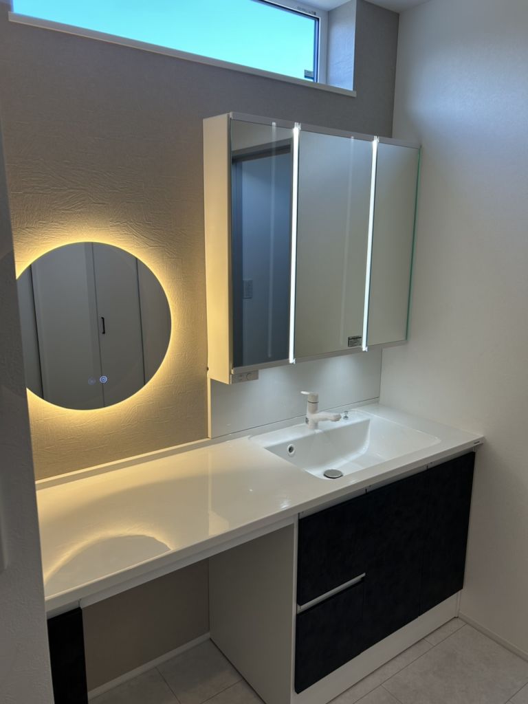 ↑お施主様こだわりの持ち込み鏡を組み合わせました
