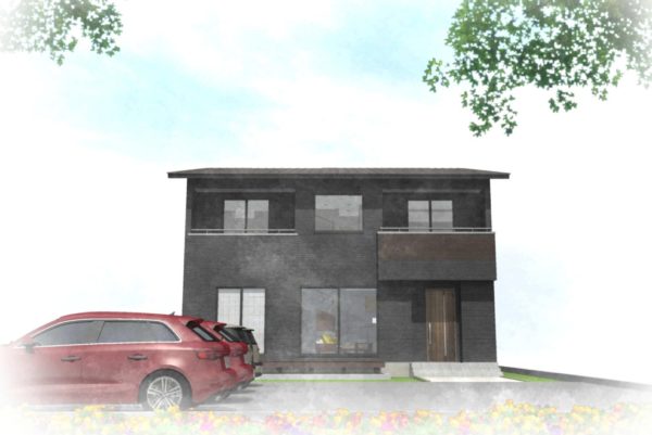 建坪34坪のむくりの家です。重厚感があるダークカラーでまとめた外観です。