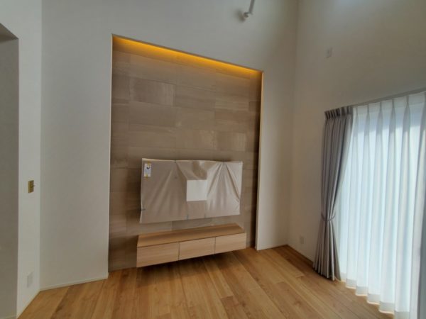 リビングのテレビ掛けには大判のエコカラットを貼り間接照明で高級感を演出しています。