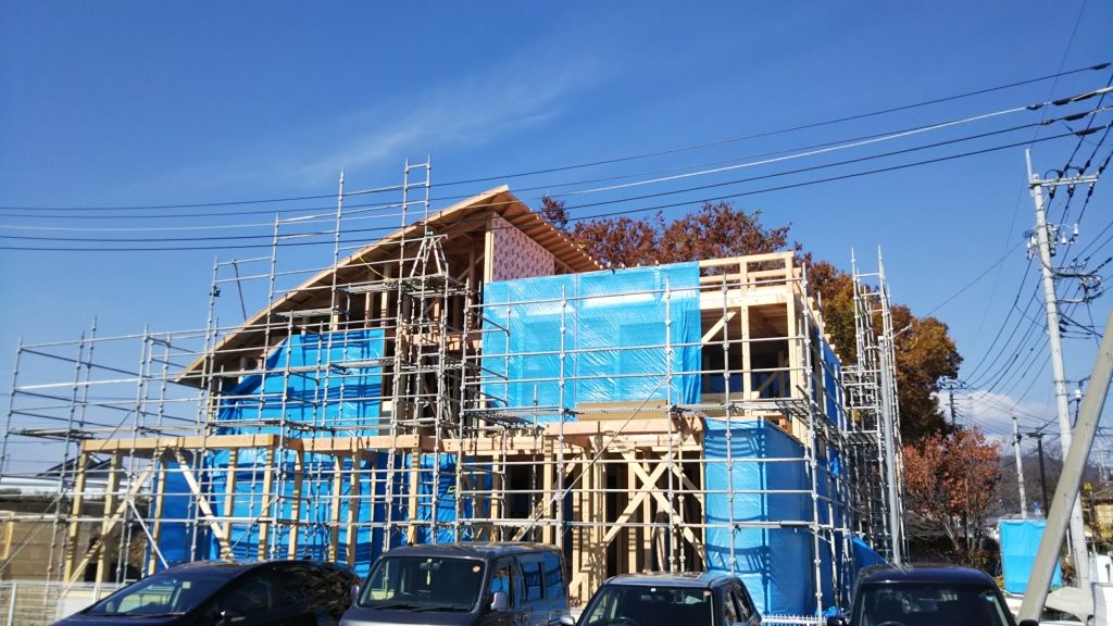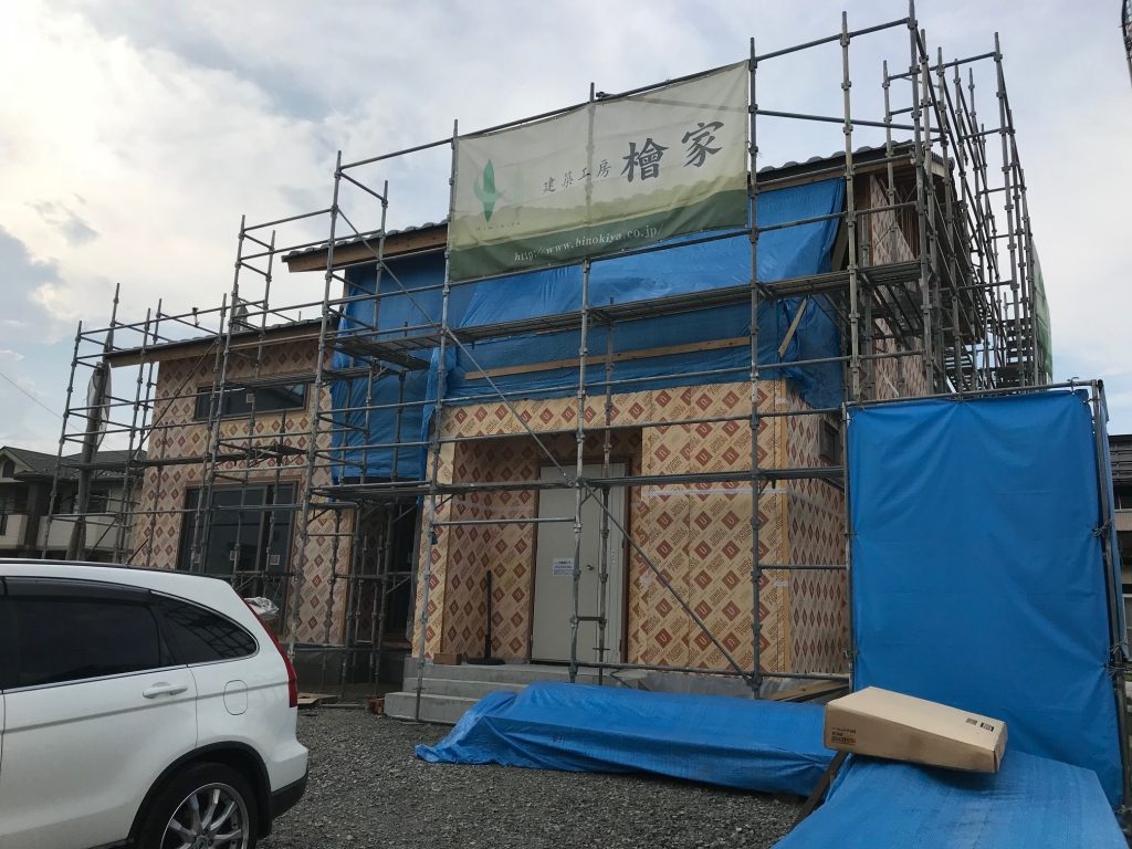 画像は檜家ダブル断熱の外側に配置される商品名ネオマフォームを取り付けた直後です。
