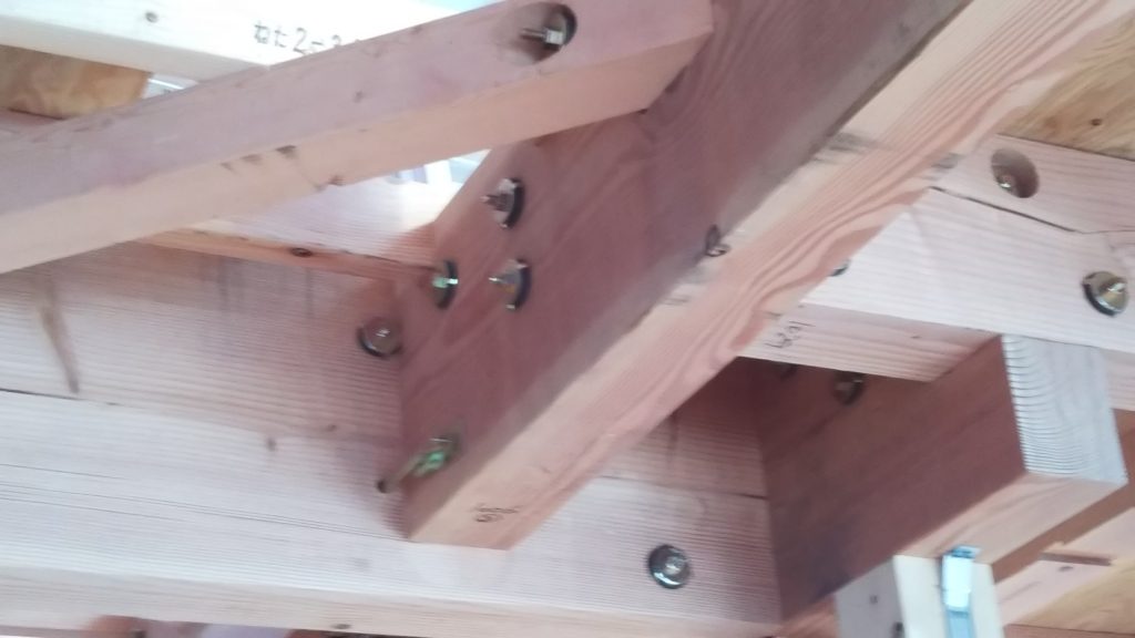 太い梁をがっちり固定する羽子板ボルトです。このたくさんの金具量は大工さん泣かせと言われています。