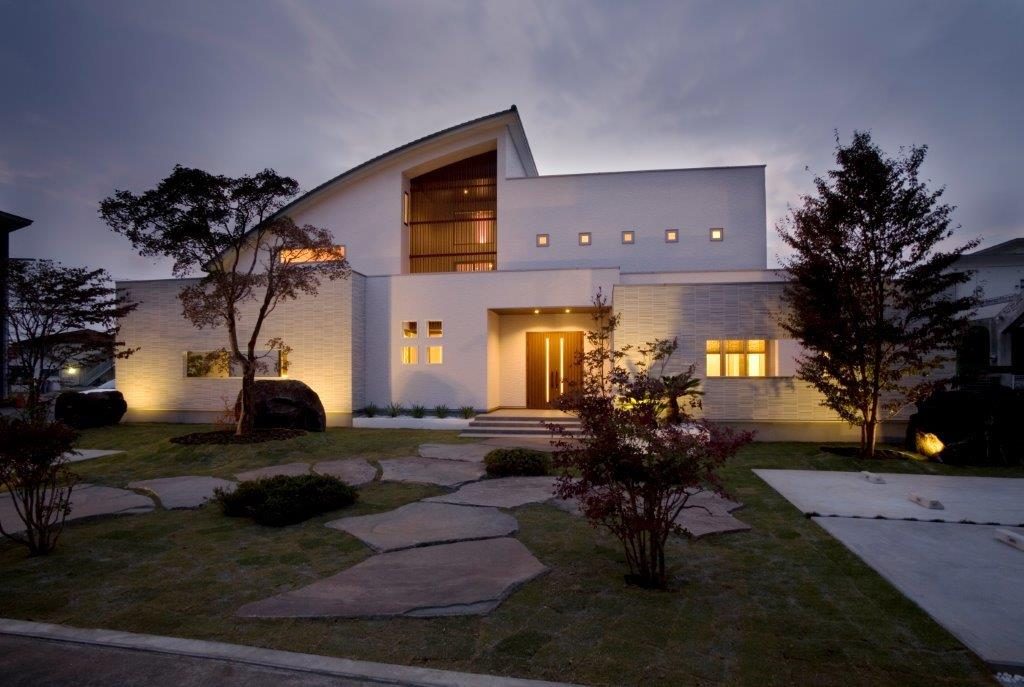 手前側にむくり屋根のデザイン、外壁左官仕上げと特徴的な外観に仕上がりました。