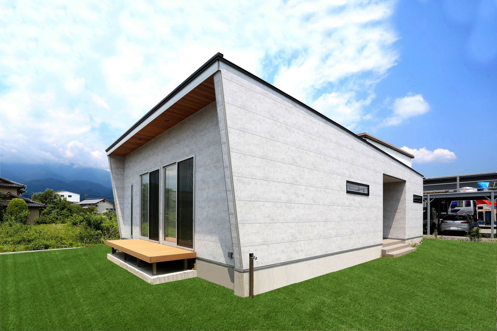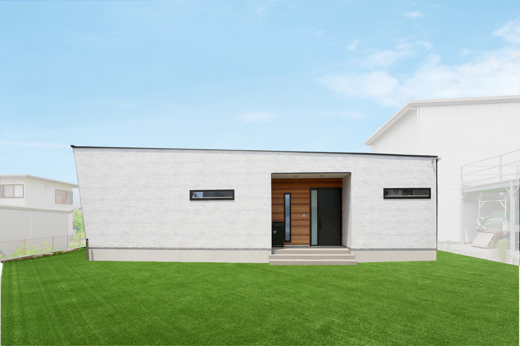 淡いグレーの無機質な外壁をベースにしたシンプルな外観、玄関回りに無垢板を張る事で質感の対比が生まれ、外観にアクセントを与えます。