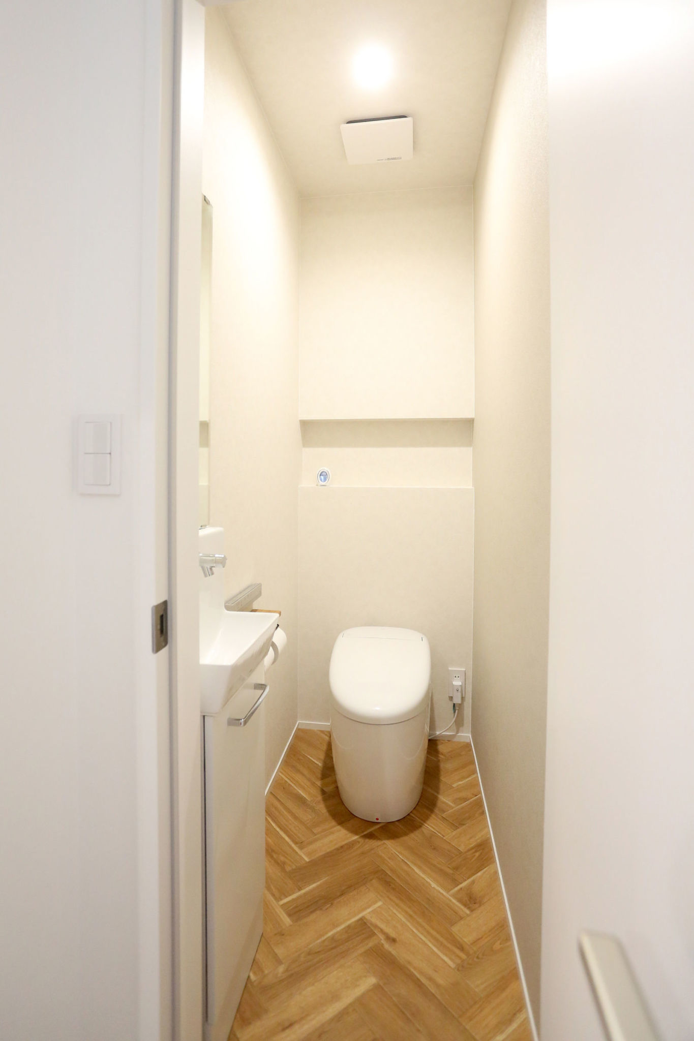 白を基調としてコーディネートされたトイレは、ヘリンボーンの床がおしゃれなアクセントに。