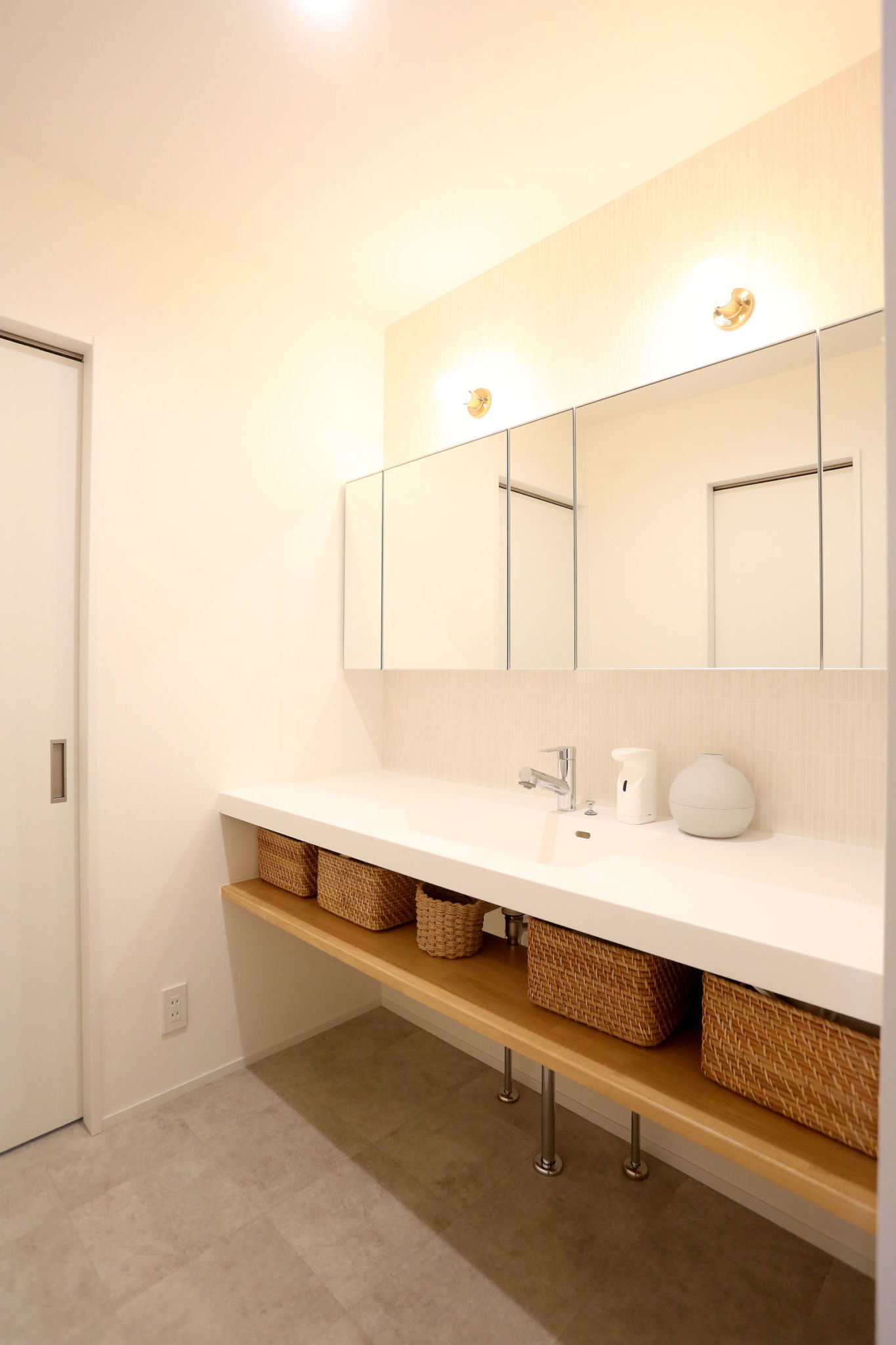 造作洗面台は間口を大きく取る事で、デザイン性だけでなく使い勝手も抜群です。