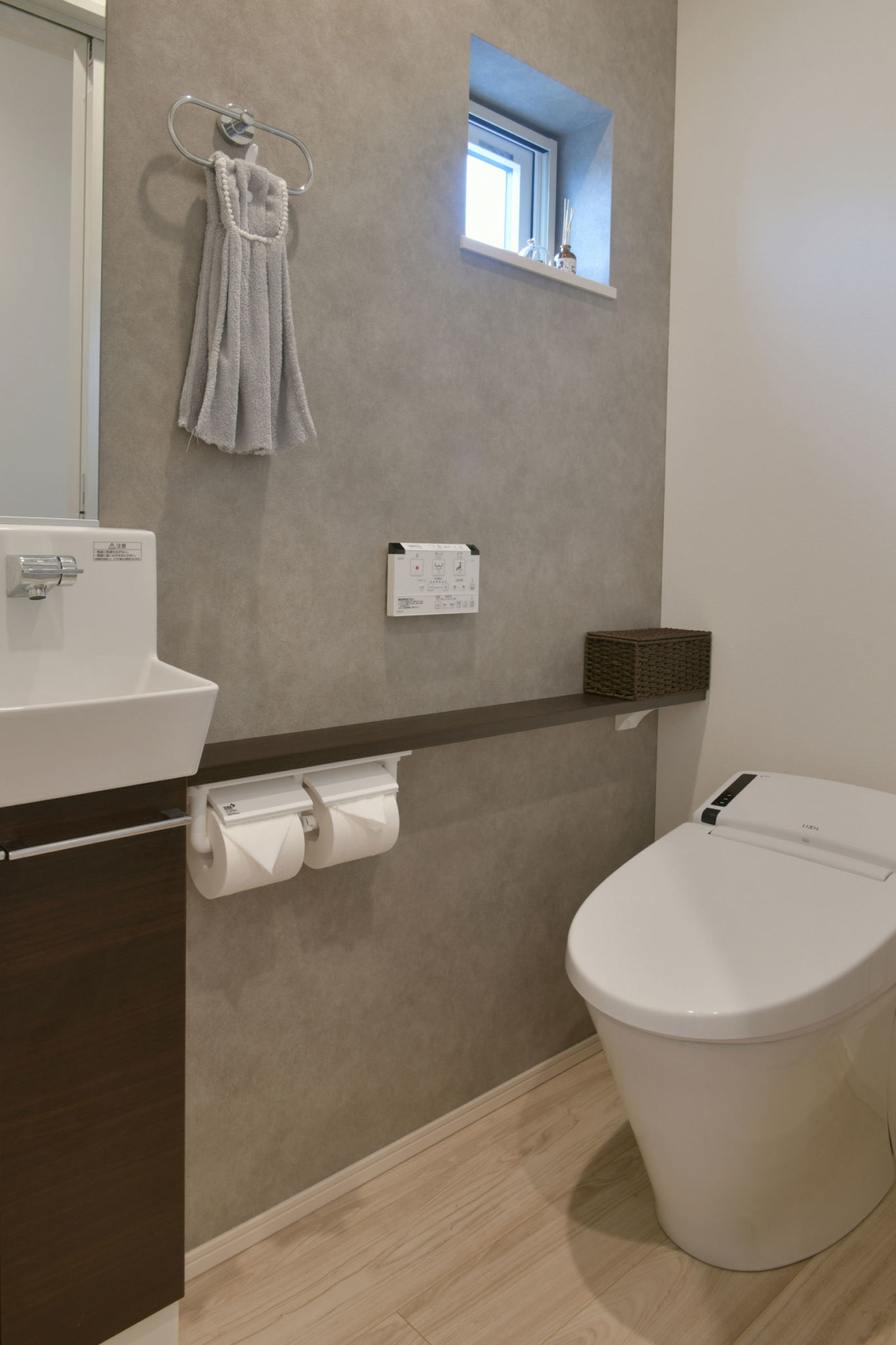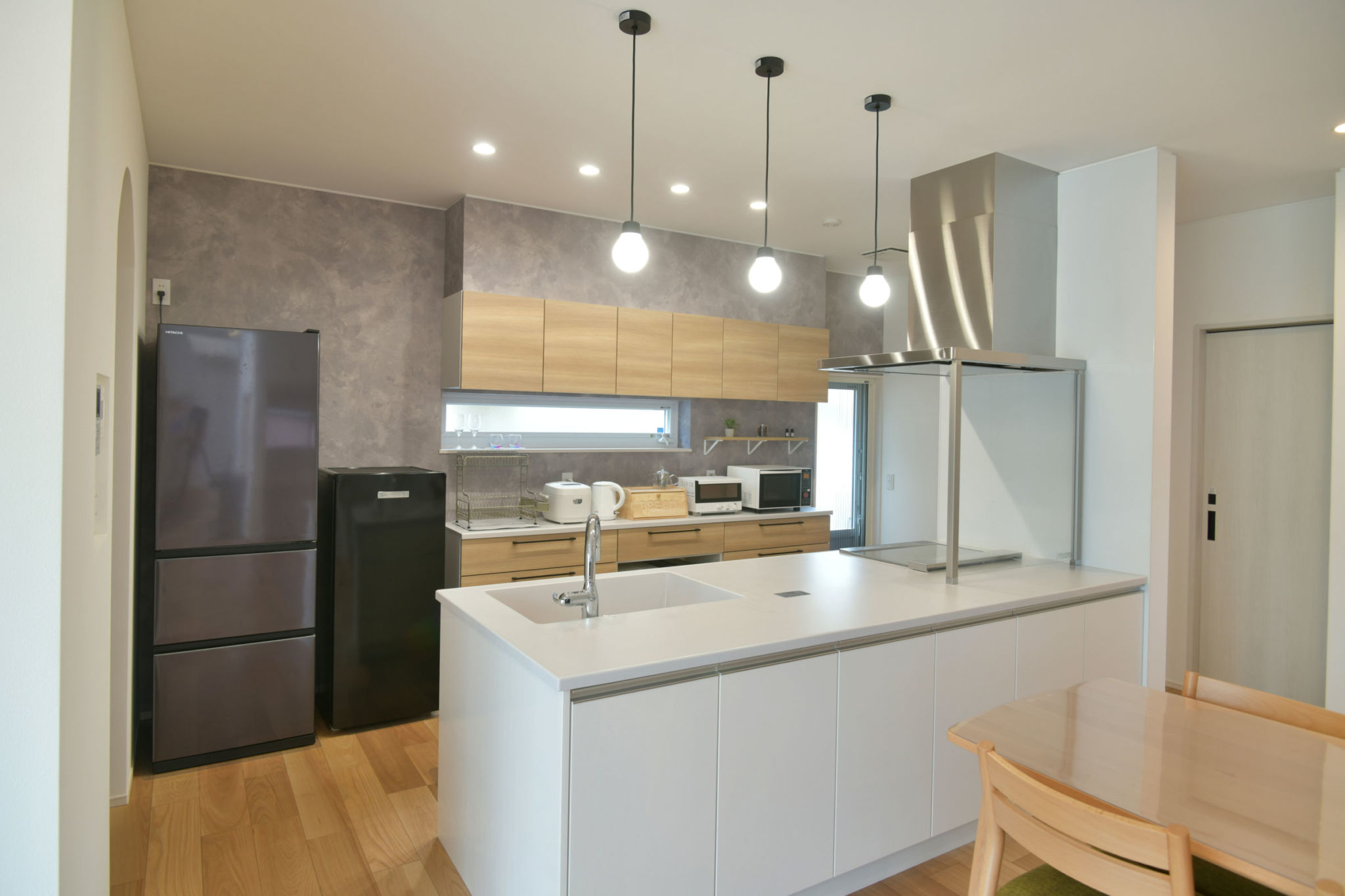 コンクリート調の壁紙に木目が美しいキッチンは動線にもゆとりがあり、毎日のお料理が楽しくなります。