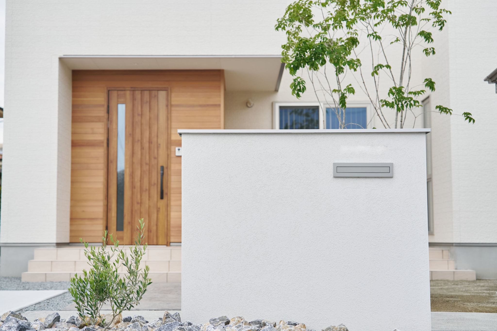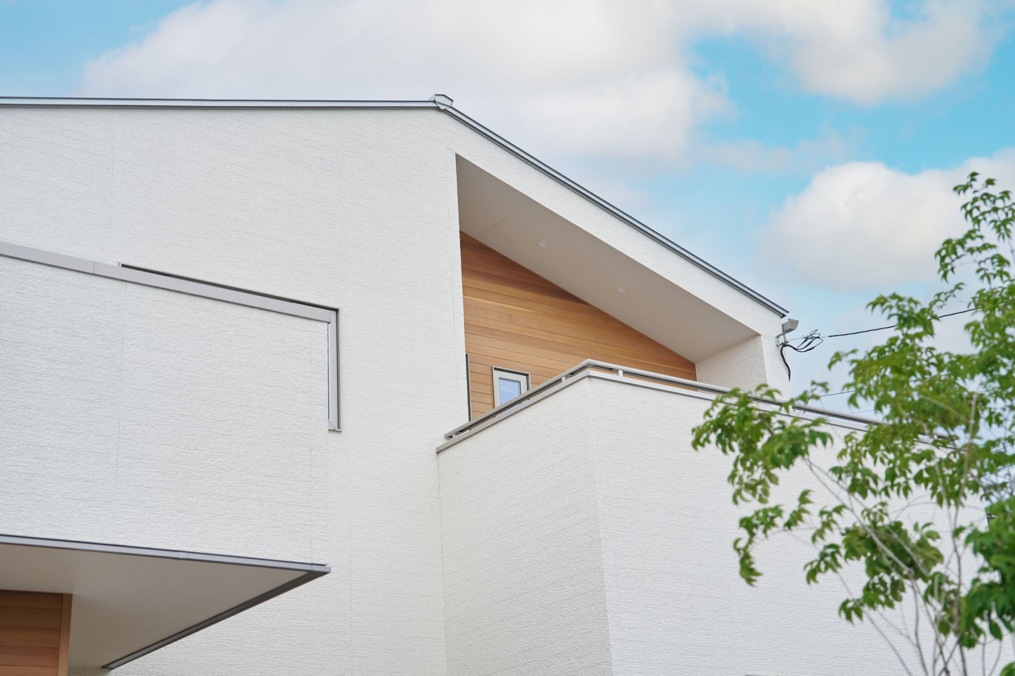 ホワイトを基調に木の質感が映える外観がやさしく街並みを彩る